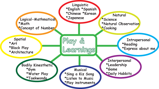 Through all of these activities and experiences our goal is to provide an opportunity for our children to be become well-rounded children who can find their talents after having such exposure. Based on the multiple intelligences theory by Howard Gardner, our curriculum allows children to experience the 8 areas that are outlined in that theory.